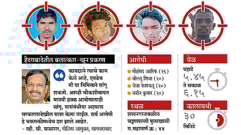 आरोपींनी मूळ गुन्हा नेमका कसा केला, याची पडताळणी करण्यासाठी पोलिसांचे एक पथक या चारही आरोपींना घेऊन हैदराबादनजीकच्या घटनास्थळी गेले होते. तेव्हा हे आरोपी पोलिसांचीच शस्त्रे घेऊन पळून जाण्याचा प्रयत्न करत असताना पोलिसांनी त्यांच्यावर गोळीबार केला, यात चारहीजण घटनास्थळीच ठार झाले.. हैदराबाद पोलिसांच्या या एन्काउंटरवर आज देशभरात गल्लीपासून ते दिल्लीतील संसदेपर्यंत सर्वत्र पडसाद उमटले. पोलिसांनी या प्रकरणातील सर्व आरोपींना पहाटेच घटनास्थळी आणले होते, ज्या ठिकाणी ही चकमक झाली, तो परिसर हैदराबादला लागूनच आहे.