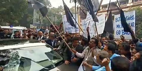 कुचबिहार - विधानसभा निवडणुकीचा निकाल (Assembly Election Result) लागल्यानंतरही पश्चिम बंगाल (West Bengal) धुमसतच आहे. राज्यपाल जगदीप धनकर (Jagdeep Dhankar) यांनी हिंसाचार (Violence) झालेल्या कुचबिहार जिल्ह्याचा दौरा केला, पण सीतलकुचीमध्ये त्यांना काळे झेंडे (Black Flag) दाखविण्यात आले. (Black flags shown to Governor Dhankar during his visit to Sitalkuchi Tour)