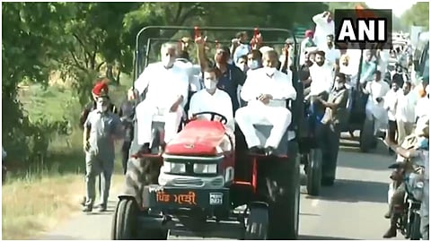 नवी दिल्ली- कृषी कायद्यावरुन काँग्रेस चांगलीच आक्रमक झाली आहे. या सुधारित कायद्यांना विरोध करण्यासाठी काँग्रेसने पंजाब-हरियाणा राज्यातून तीन दिवसाच्या ट्रॅक्टर रॅलीचे आयोजन केले आहे. 'खेत बचाव यात्रे'अंतर्गत राहुल गांधी स्वत: ट्रॅक्टर चालवत असल्याचं पाहायला मिळालं. यावेळी पंजाबचे मुख्यमंत्री अमरिंदर सिंग आणि राज्य प्रमुख सुनिल जाखर हेही उपस्थित होते.