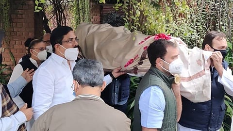 दिल्ली - काँग्रेस नेते आणि माजी केंद्रीय मंत्री कॅप्टन सतिश शर्मा यांचे बुधवारी गोव्यात निधन झाले. वयाच्या 73 व्या वर्षी त्यांनी अखेरचा श्वास घेतला. सतिश शर्मा हे कर्करोगाशी झुंज देत होते. त्यांच्या निधनानंतर काँग्रेसचे माजी अध्यक्ष राहुल गांधी यांनी शोक व्यक्त केला होता. आता सतिश शर्मा यांच्या अंत्ययात्रेवेळी त्यांच्या पार्थिवाला खांदाही दिला.