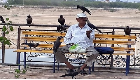 डायालाल यांच्या हातावर खेळतात कावळे