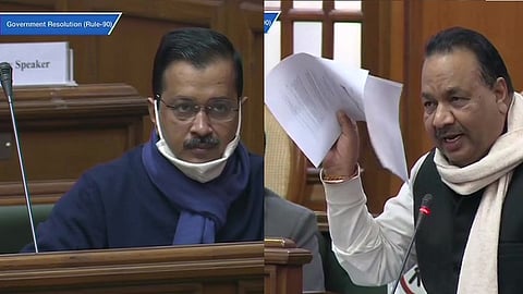 नवी दिल्ली - अरविंद केजरीवाल यांच्या दिल्ली सरकारने भाजपची सत्ता असलेल्या नगर पालिकांमध्ये 2400 कोटी रुपयांचा कथित गैरव्यवहार प्रकरणी एक दिवसाचं विशेष अधिवेशन बोलावण्यात आलं आहे. दिल्ली विधानसभेच्या विशेष अधिवेशनाच्या सुरुवातीलाच केंद्राने केलेल्या तीन कृषी कायद्यावर चर्चा झाली. कृषी कायद्याबाबत मंत्री कैलास गेहलोत यांनी चर्चा सुरु केली. यावेळी आम आदमी पक्षाच्या आमदारांनी जय जवान, जय किसान अशी घोषणाबाजी केली.
