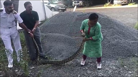 विद्या राजू (वय 60) असे महिलेचे नाव आहे. विद्या या सर्पमित्र म्हणून काम करतात. एका कुटुंबाच्या आवारामध्ये मोठे अजगर आढळले. याबाबतची माहिती विद्या यांना मिळाल्यानंतर त्या तत्काळ घटनास्थळी आल्या व अजगराला राजू नावाने हाक मारत त्याला अलगद पकडले व गोणीत भरले.