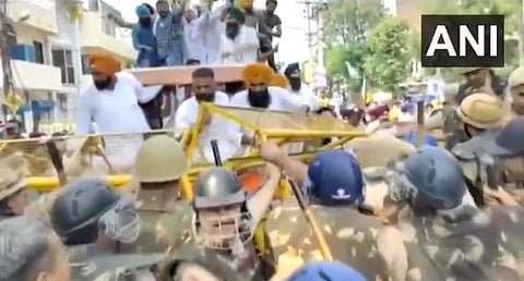 पोलिसांनी लावलेल्या बॅरिकेट्सवर चढाईचा प्रयत्न करत त्यांनी मोडतोड केली. शेतकरी आक्रमक झालेले पाहता त्यांना पांगवण्यासाठी पोलिसांनी पाण्याच्या फवाऱ्यांचा वापर करावा लागला.