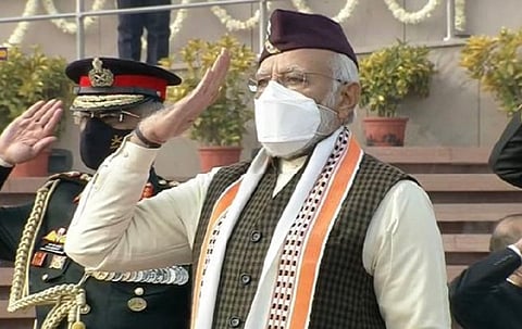 नवी दिल्ली - प्रजासत्ताक दिनी (Republic Day) पंतप्रधान नरेंद्र मोदी यांचा यावेळी नवा लूक बघायला मिळाला. प्रजासत्ताक दिन आणि स्वातंत्र्य दिनी पंतप्रधान मोदींचा (PM Narendra Modi) पेहराव हासुद्धा चर्चेत असतो. यावेळी त्यांनी डोक्यावर टोपी आणि गळ्यात घातलेला उपरणा दोन राज्यांची खास अशी ओळख आहे. मोदींनी घातलेली टोपी उत्तराखंडची (Uttarakhand) आणि उपरणा मणिपूरचा (Manipur) आहे.