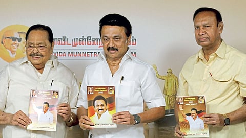द्रमुकचे अध्यक्ष एम. के. स्टॅलिन यांनी अण्णा अरिवलयम या पक्षाच्या मुख्यालयात जाहीरनाम्याचे प्रकाशन केले. याआधी त्यांनी मरिना बीचवर जाऊन दिवंगत नेते सी. एन. अण्णादुराई आणि एम. करुणानिधी यांच्या स्मारकाचे दर्शन घेऊन आदरांजली वाहिली. इंधन व गॅस दरात कपात करण्याबरोबरच ५०० घोषणा केल्या आहेत. यामध्ये शैक्षणिक कर्जाची माफी, आविन दुधाचा दर तीन रुपयांनी कमी करणे, शिधापत्रिकाधारकांना चार हजार रुपये मदतनिधी देणे, सरकारी शाळेतील विद्यार्थ्यांना मोफत टॅब वाटप, ‘नीट’ परीक्षा रद्द करणे या काही ठळक घोषणा आहेत.