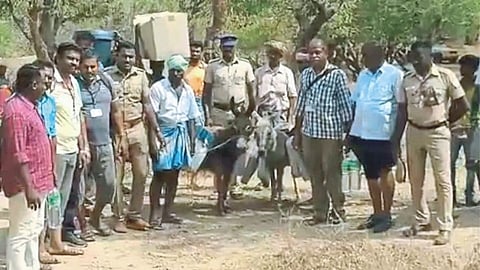 चेन्नई- सध्या चार राज्ये आणि केंद्रशासित प्रदेशांमध्ये विधानसभेच्या निवडणुकीची रणधुमाळी सुरु आहे. पश्चिम बंगालमध्ये विधासभेच्या तिसऱ्या टप्प्यातील मतदान पार पडले असून अनेक राज्यात दुसऱ्या टप्प्यातील मतदान पार पडले. तमिळनाडूमध्ये ईव्हीएम वाहून नेण्यासाठी गाढवांची मदत घेण्यात आली होती. तमिळनाडूतील ईरोड आणि धर्मापुरी जिल्ह्यांत विधानसभा निवडणुकीच्या तिसऱ्या टप्प्यात ईव्हीएम वाहून नेण्यासाठी गाढवांचा वापर करण्यात आला. अंथीयूर मतदारसंघातील कथीरीमलाई खेड्यात रस्ते खराब असल्यामुळे वाहने जाणे शक्य नाही. त्यामुळे निवडणूक अधिकाऱ्यांनी गावकऱ्यांच्या मदतीने गाढवांची मदत घेतली. धर्मापुरी जिल्ह्यातही डोंगराळ भागांतील मतदान केंद्रांवर ईव्हीएम आणि अन्य सामग्री नेण्यासाठी गाढवे उपयुक्त ठरली. धर्मापुरीमध्ये पाच मतदारसंघ आहेत. गाढवांच्या मदतीने तयारी केली जात असताना पोलिस बंदोबस्त कायम होता.