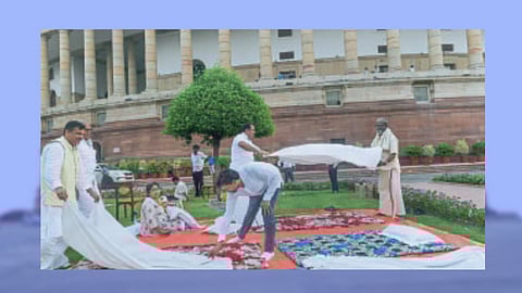 बरोबर एका वर्षापूर्वी कृषी कायद्यांवरील गदारोळानंतर राज्यसभेतील १३ खासदारांना निलंबित करण्यात आले होते. तेव्हाही संपूर्ण अधिवेशनादरम्यान असेच वातावरण होते. सर्वपक्षीय खासदारांच्या वर्दळीने हा परिसर जिवंत भासत असे. तेच चित्र बुधवारी दिसले. मंगळवारी निलंबित झालेले १९ व बुधवारी त्यात भर पडलेले संजय सिंह यांनी गांधी पुतळ्यासमोर ठाण मांडले आहे.