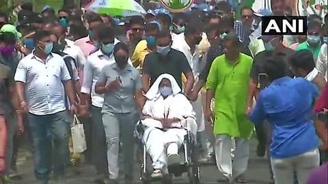 कोलकाता- पश्चिम बंगाल विधानसभा निवडणुकीतील पहिल्या टप्प्यातील मदतान पार पडले असून आता दुसऱ्या टप्प्यातील लढतीला सुरुवात झाली आहे. सोमवारी मुख्यमंत्री ममता बॅनर्जी यांनी आपला निवडणूक मतदारसंघ नंदीग्राममध्ये व्हिलचेअरवरुन रोड शो केला. या 'रोड शो'ला हजारो लोकांनी उपस्थिती लावली होती. ममता सोमवारी खुदीराम रोड ते नंदीग्रामच्या ब्लॉक-२ पर्यंत रोड शो केला. यावेळी भर उन्हात त्या व्हिलचेअरवरुन प्रचार करताना दिसल्या. कथितरीत्या झालेल्या हल्ल्यात ममता बॅनर्जी जखमी झाल्या आहेत. यामुळे त्यांच्या पायाला दुखापत झाली असून त्यांना व्हिलचेअरचे सहाय्य घ्यावे लागत आहे. अशा परिस्थितीतही त्यांनी वरुन सूर्य आग ओकत असताना प्रचार केला.