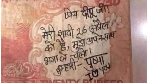 सध्या 20 रुपयांची नोट इंटरनेटवर मोठ्या प्रमाणात व्हायरल होत आहे. या नोटेवर पुष्पाने दीपूसाठी एक प्रेमळ संदेश लिहून मला पळवून न्या असे म्हणत आहे. पुष्पाने नोटेवर लिहिलेय, "प्रिय दीपू जी. माझे 26 एप्रिलला आहे. मला पळवून न्या. तुमची पुष्पा, आय लव्ह यू''