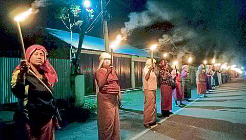 इंफाळ : गेल्या महिन्याभराहून अधिक काळ हिंसाचारात होरपळणाऱ्या मणिपूरमध्ये शांततेसाठी महिलांनी पुढाकार घेता आहे. राज्यात अनेक जिल्ह्यांत हिंसाचाराचा निषेध करण्यासाठी शेकडो महिला रस्त्यांवर उतरल्या. मैतेई समुदायातील हातात मशाल घेतलेल्या महिलांनी इंफाळ पूर्व, इंफाळ पश्चिम आणि काकचिंग या जिल्ह्यांत रस्त्यावर मानवी साखळी करत शांततेसाठी आवाहन केले.
