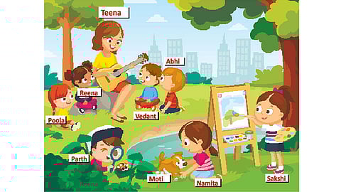 7) Sakshi is sitting under a tree. 8) Teena is standing.
