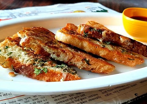 ब्रेड स्लाइस त्रिकोणी कापून घ्या. पॅन तापायला ठेवून त्यात बटर घाला. ब्रेड स्लाइस मिश्रणात भिजवून पॅनमध्ये दोन्ही बाजूंनी लालसर होईपर्यंत भाजून घ्या.
