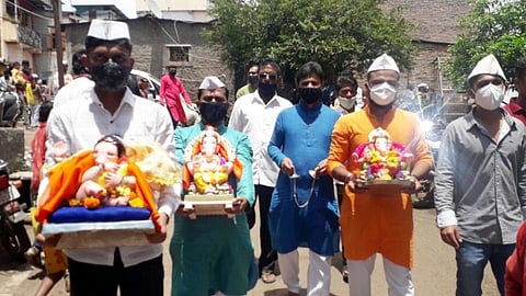 कऱ्हाड (सातारा) : ना ढोल-ताशा, झांज पथकाचा गजर, ना बॅण्ड- बॅन्जोचे वादन केवळ 'गणपती बाप्पा मोरया,....मंगलमूर्ती मोरया'च्या गजरात उत्साहाला आवार घालत आज कऱ्हाडवासिसांनी लाडक्या विघ्नहर्त्याची (Ganeshotsav 2021) उत्साहात प्रतिष्ठापना केली. गणेशोत्सव मंडळांनीही कोरोनाचं (Coronavirus) भान ठेवून स्वतःहून उत्साहावर मर्यादा घालून बहुतांश ठिकाणी मंदिरात, खासगी जागेत मूर्तींची प्रतिष्ठापना केली.