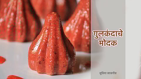 कृती - तेल अथवा तूप गरम करुन रवा मैदा यात घालावे. ते एकसारखे कालवावे. नंतर दूध घालून रवा मैदा घट्ट भिजवावा. गुलकंदामध्ये काजू व बदाम यांचे बारीक तुकडे घालून सारण एकसारखे तयार करावे. रवा व मैदा चांगला दोन तास तरी भिजायला हवा. नंतर चांगले कुटू त्याच्या गोळ्या कराव्यात. गोळ्यांच्या पुऱ्या लाटून (पारी) त्याला मोदकाचा आकार देऊन त्या वाटीत सारण भरावे व मोदकाच्या मुखऱ्या बंद करुन मोदक मंद आचेवर तळावेत. गुलकंदामुळे मोदकांना सुंदर स्वाद येतो.