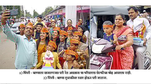 पिंपरी - धोतर, कुर्ता, डोक्यावर टोपी, कपाळी गंध, किन् किन्णारी घंटी आणि मुखाने ‘गणपती बाप्पाऽ मोरयाऽऽ, मंगलमूर्तीऽ मोरयाऽऽ’ असा जयघोष करीत लाडक्या गणरायाला घराघरांत विराजमान करणारे भाविक सोमवारी (ता. २) चिंचवडमध्ये बघायला मिळाले. सकाळपासून दुपारपर्यंत संपूर्ण शहरात असेच वातावरण होते. सायंकाळी ताशांचा तर्रर्र आवाज आणि ढोलांचे ठेके ऐकू येऊ लागले. आकर्षक पद्धतीने सजवलेले रथ दिसले. कारण, गणेश मंडळांनी मिरवणूक काढून लाडक्या बाप्पाला विधिवत विराजमान केले. बच्चे कंपनीसह मोठ्यांचाही उत्साह होता. मोदकांचा नैवेद्य दाखवून आणि ‘सुखकर्ता, दुखहर्ता’ आरतीची आळवणी करून आनंदपर्वाची सुरवात झाली.