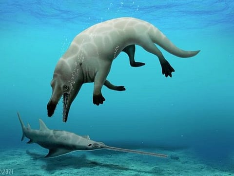 नवी दिल्ली : तुम्हाला जर कुणी असं सांगितलं की माशांना सुद्धा पाय होते, आणि ते पोहण्यासोबतच जमिनीवर चार पायांनी चालू शकत होते. हे ऐकून तुम्ही एखाद्याला वेड्यात नक्कीच काढाल. मात्र, थांबा! कारण तब्बल 4 कोटी 30 लाख वर्षांपूर्वी पृथ्वीवर अशा प्रकारच्या माशांची प्रजाती अस्तित्वात होती. चार पाय असणाऱ्या देवमाशांची प्रजाती इजिप्तमध्ये अस्तित्वात असल्याचा शोध संशोधकांनी लावलाय. या प्रजातीला फिओमिसिटस अनुबिस असं नाव देण्यात आले आहे. इजिप्तच्या पश्चिम भागातील एका वाळवंटात देवमाशाचे हे जीवाश्म आढळून आले आहेत. या जीवाश्माच्या कवटीचा आकार इजिप्तमधील अनुबिस या देवतेसारखी असल्याने त्याला अनुबिस हेच नाव देण्यात आल्याची माहिती शास्त्रज्ञांनी दिली.