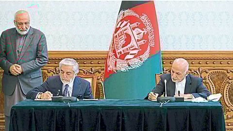 काबूल - अफगाणिस्तानातील तब्बल महिनाभराची राजकीय अस्थिरता संपुष्टात आली असून विद्यमान अध्यक्ष अश्रफ घनी आणि त्यांचे प्रतिस्पर्धी अब्दुल्ला अब्दुल्ला यांनी आज सत्ता वाटपाच्या करारावर स्वाक्षऱ्या केल्या.