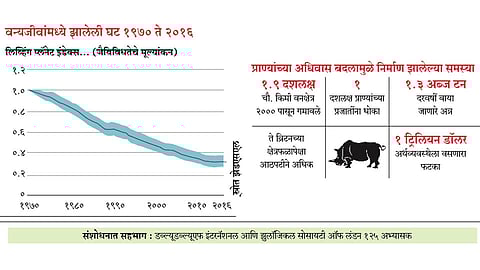 लंडन - माणसाची हाव दिवसेंदिवस वाढत चालल्याने त्याचे प्रतिकूल परिणाम निसर्गसृष्टीवर होताना दिसतात, बेसुमार जंगलतोडीमुळे वन्यप्राण्यांचा अधिवासच संपुष्टात येऊ लागला असून, याचा विपरीत परिणाम त्यांच्या अस्तित्वावर होऊ लागला आहे. मागील पन्नास वर्षांच्या काळामध्ये वन्यप्राण्यांची संख्या दोनतृतीयांशाने घटल्याचे वर्ल्डवाइड फंड फॉर नेचरने (डब्ल्यूडब्ल्यूएफ) प्रसिद्ध केलेल्या अहवालात म्हटले आहे. ही विनाशकारी घट काही केल्या थांबण्याची चिन्हे नसून निसर्गाच्या विध्वंसाचा हा वेग याआधी कधीही एवढा प्रचंड नव्हता, असे या संघटनेचे म्हणणे आहे.