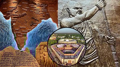 नव्या संसद भवनमध्ये लावण्यात आलेल्या भित्तीचित्रात (म्युरल) सम्राट अशोकाचे संपूर्ण साम्राज्य दाखवण्यात आलं आहे. शेजारील अनेक देशांचा यात समावेश असून अखंड भारताचा हा नकाशा आहे असा त्याचा अर्थ लावला जात आहे.