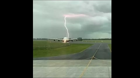 प्रसारमाध्यमांनी दिलेल्या वृत्तानुसार, न्यूझीलंडला वादळाचा तडाखा बसत असून, याचा फटका विमानसेवेलाही बसत आहे. क्राइस्टचर्च येथे विमानतळावर विमान थांबले असताना प्रवासी वेटिंगरुममध्ये बसले होते. बाहेर विजा चमकत होत्या. यावेळी एक प्रवासी छायाचित्र काढत होता. एमिरेट्स A-380 विमानावर वीज पडत असतानाची घटना कॅमेऱयात कैद झाली. पण, विमानवर वीज न कोसळता बाजूला कोसळली. मात्र, छायाचित्रामध्ये विमानावर कोसळत असल्याचे भासत आहे.