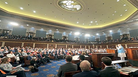 पंतप्रधान मोदी यांनी भारतीय प्रमाणवेळेनुसार शुक्रवारी पहाटे अमेरिकी काँग्रेसच्या संयुक्त बैठकीला संबोधित केले. यावेळी काँग्रेस सदस्य, सिनेटर उपस्थित होते. तसेच अनेक भारतीय अमेरिकी नागरिक गॅलरीतून मोदींचे भाषण ऐकत होते.