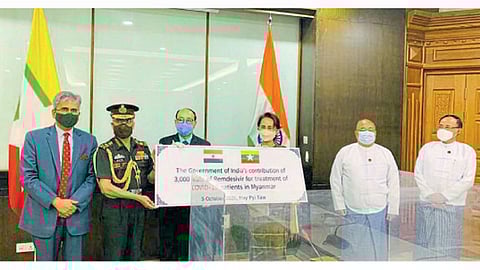 नय प्यी ताव (म्यानमार) - म्यानमार या मित्रत्वाचे संबंध असलेल्या शेजारी देशाला मदत म्हणून भारताने रेमडेसिव्हिर या कोरोनावरील औषधाच्या तीन हजार कुप्या दिल्या आहेत. ईशान्येकडील राज्यांतील बंडखोरांचा उपद्रव तसेच चीनविरुद्धच्या संघर्षाच्या पार्श्वभूमीवर ही कृती महत्त्वाची ठरली आहे.