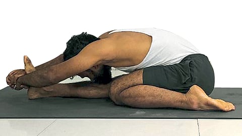 श्वास सोडत धड वाकवा आणि पोट, छाती व हनुवटी अनुक्रमे मांडी, गुडघा व नडगी या भागांवर टेकवा.