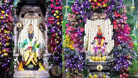 पंढरपूर (सोलापूर) : इंग्रजी नवीन वर्षारंभाच्या 2022 (New Year 2022) निमित्ताने श्री विठ्ठल- रुक्मिणी मंदिरात विविध रंगांची तब्बल 1500 किलो फुले आणि 700 किलो फळे वापरून मनमोहक आरास करण्यात आली आहे. फुलांची आरास करण्यासाठी प्रदीप प्रकाश ठाकूर पाटील (आळंदी, पुणे) यांनी फुले उपलब्ध करून दिली. (Shri Vitthal-Rukmini temple in Pandharpur decorated with various flowers and fruits)