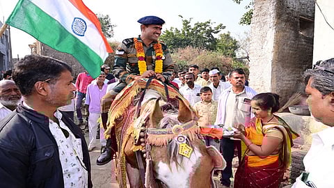 देवगांव रंगारी (जि.औरंगाबाद) : भारतीय लष्करात सतरा वर्षांच्या प्रदीर्घ देशसेवेनंतर सेवानिवृत्त झालेले कन्नड तालुक्यातील ताडपिंपळगांव येथील सुपुत्र फौजी सतपालसिंग शिवसिंग महेर यांचे ग्रामस्थांच्या वतीने जंगी स्वागत करण्यात आले. हातात तिरंगा देऊन घोड्यावर बसवून जंगी मिरवणूक काढण्यात आली. देशसेवा करून आपल्या घरी परतणाऱ्या जवानास ताडपिंपळगांव येथील ग्रामस्थांनी अनोखा सॅल्यूट ठोकला आहे. सतरा वर्षांची प्रदीर्घ सेवा बजावल्यानंतर ते आपल्या मुळगावी परतले आहेत. ताडपिंपळगाव ग्रामस्थांनी जातपात, धर्म, पंथ गट-तट विसरून जल्लोषात मिरवणूक काढली.