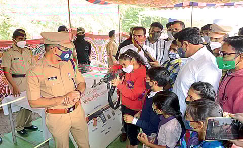 या वेळी विद्यार्थ्यांना ९ एमएम पिस्तूल, एसएलआर रायफल, इन्सास, एके ४७, ग्लॉक, कार्बाइन, रिव्हॉल्व्हर, थ्री नॉट थ्री, पंप ॲक्शन, टिअर गॅस इत्यादी शस्त्रांची सविस्तर माहिती देण्यात आली. या वेळी श्वानपथकातील लॅबरेडॉर, जर्मन शेफर्ड, डॉबरमन ब्रीडच्या श्वानांचे विद्यार्थ्यांनी निरीक्षण केले.