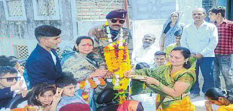 पारोळा - भारतीय सैन्यदलातील जवान संतोष रामदास पाटील हे २६ वर्षांच्या प्रदीर्घ देशसेवेनंतर नुकतेच गावी परतले. या वेळी सेवापूर्तीनिमित्त गौरव सोहळा आयोजित करण्यात आला होता. ते सैन्यदलात कोर ऑफ सिग्नलमध्ये एसीपी नायक सुभेदार या पदावर कार्यरत होते. सैन्यदलात प्रदीर्घ काळ सेवा केल्यानंतर जवान संतोष पाटील हे आपल्या गावी परतताच ग्रामस्थांनी त्यांचे जंगी स्वागत केले. या वेळी खानदेशी रक्षक ग्रुपतर्फे सजावट केलेल्या वाहनातून त्यांची रत्नापिंप्री, दबापिंप्री, होळपिंप्री या तिन्ही गावातून बँडच्या तालावर सवाद्य मिरवणूक काढण्यात आली. घरोघरी महिलांनी त्यांचे औक्षण केले.