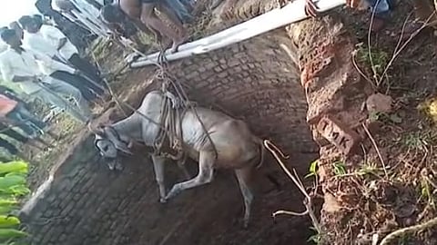 गणपूर(ता चोपडा) : येथील अशोक देवराम पाटील (शिवा आण्णा) यांच्या मालकीची बैलजोडी शेतात चरत असतांना एका बैलाने (Bull) दुसऱ्या बैलाला मारले. आणि तो बैल विहिरीत (Well) पडला. जीवावर बेतले आणि शिंगांवर निभावल्याने शेतकरी (farmer) व ग्रामस्थांनी (villagers) या बैलाला सहीसलामत बाहेर काढले. (villagers rescued the ox that fell into the well)