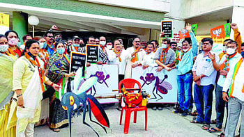 जळगाव शहरात दोन महिन्यांपासून साथीच्या रोगांनी थैमान घातले आहे. मलेरिया, डेंगी, फ्लूने नागरिक आजारी पडत असून, प्रत्येक घरात रुग्ण आढळत आहे, अशी स्थिती असताना जळगाव महापालिकेतर्फे कोणत्याही प्रकारच्या उपाययोजना केल्या जात नाहीत. पावसाळ्यात ठिकठिकाणी डबके साचले असून, कचरा उचलला जात नाही. डबक्यांमध्ये फवारणीही केली जात नाही. फवारणी करणारी १५ मशिन धूळखात आहेत. त्याचा निषेध म्हणून हे आंदोलन करण्यात आले. जिल्हाध्यक्ष तथा आमदार सुरेश भोळे यांच्या मार्गदर्शनाखाली महानगर जिल्हाध्यक्ष दीपक सूर्यवंशी यांच्या नेतृत्वात हे आंदोलन केले.
