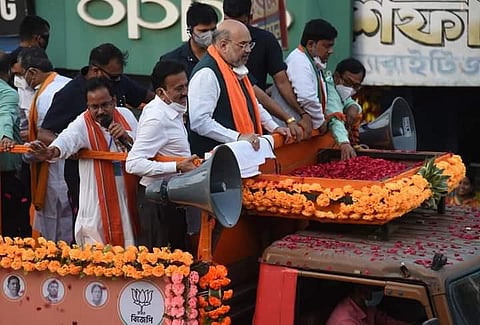 जळगाव : पश्चिम बंगालमधील निवडणूक रणसंग्राम शिगेला पोचलेला असताना राज्यातून नियोजनासाठी गेलेल्या गिरीश महाजनांना सोमवारी भाजपनेते तथा केंद्रीय गृहमंत्री अमित शहांनी त्यांच्यासोबत रोड शोच्या प्रचाररथावर बोलावून घेतले. ‘ये गिरीशभाई महाराष्ट्र से आए है भाजपा को जिताने के लिए.. ताली बजाओ इनके लिए.. असे सांगत शहांनी महाजनांचा गौरव केला.