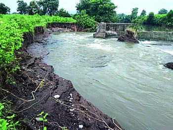 तोंडापूर (जळगाव) : तोंडापूर (ता. जामनेर) येथील खडकी नदीवर बांधण्यात आलेल्या सिमेंटच्या बंधाऱ्याच्या बाजूचा भराव वाहून गेल्याने नदीचे पाणी थेट शेतात शिरले. यामुळे शेतातील माती वाहून गेल्याने शेतकऱ्यांचे मोठ्या प्रमाणात नुकसान झाले आहे. नदीने आता पात्र सोडून शेतातून वळण घेतले आहे.