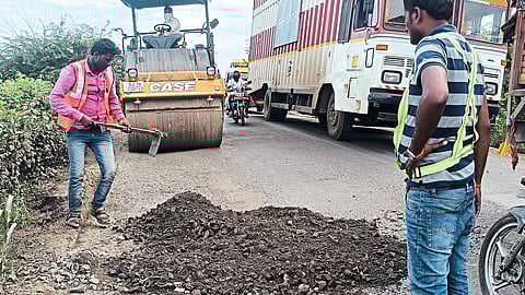 मेहुणबारे (जि. जळगाव) : चाळीसगाव-धुळे रस्त्याची दुरवस्था झाली असून, तरवाडे बारी ते चाळीसगाव बायपासपर्यंत तर रस्त्यावर अक्षरश: खड्ड्यांचे साम्राज्य पसरले आहे. या संदर्भात ‘सकाळ’मध्ये वेळोवेळी झळकलेल्या वस्तुनिष्ठ वृत्ताची दखल राष्ट्रीय महामार्ग विभागाने घेतली असून, या रस्त्यावरील खड्ड्यांमध्ये मातीमिश्रीत खडी टाकून खड्डे बुजविण्याची गांधीगिरी केली आहे. मात्र प्रत्यक्षात डांबर टाकून रस्त्यावरील खड्डे बुजवावेत, अशी मागणी होत आहे. (pothole repairing start on Tarwade Bari to Chalisgaon Bypass after sakal action Jalgaon Latest Marathi News)