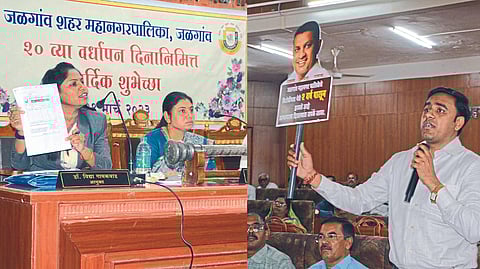 सतरा मजली इमारतीच्या दुसऱ्या मजल्यावर मंगळवारी (ता. २१) महापालिकेची महासभा झाली. पीठासीन अध्यक्षपदी महापौर जयश्री महाजन होत्या. उपमहापौर कुलभूषण पाटील, आयुक्त डॉ. विद्या गायकवाड, नगरसचिव सुनील गोराणे व्यासपीठावर उपस्थित होते.