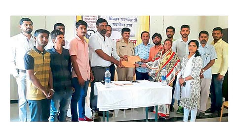 येथील हॉटेल त्रिवेणीच्या सभागृहात कोडोलीचे सहायक पोलिस निरीक्षक संजीवकुमार झाडे, केखले प्राथमिक केंद्राचे वैद्यकीय अधिकारी डॉ. एस. बी. पाटील, उद्योजक विशाल जाधव याच्या हस्ते कॅन्सरग्रस्त कुटुंबांना मदत दिली.
