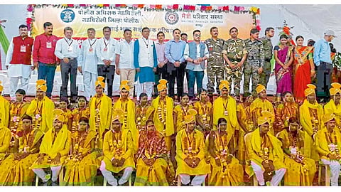 अहेरी (जि. गडचिरोली) - पोलिसांनी पुढाकार घेऊन आयोजित केलेल्या सोहळ्यात पाच शरणागत नक्षलवाद्यांसह ५४ आदिवासी जोडपी विवाहबद्ध झाली. पोलिसांच्या या पुढाकाराचे येथे कौतुक होत आहे.