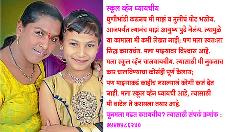 धुणीभांडी करूनच मी माझं व मुलीचं पोट भरतेय. आजपर्यंत त्यानंच माझं आयुष्य पुढे नेलंय. त्यामुळे या कामाला मी कमी लेखत नाही; पण मला स्वतःला सिद्ध करायचंय. मला माझ्यावर विश्वास आहे. मला स्कूल व्हॅन चालवायचीय. त्यासाठी मी नुकताच कार चालविण्याचा कोर्सही पूर्ण केलाय; पण माझ्याकडं काहीच नसल्यानं कोणी कर्ज देत नाही. मला स्कूल व्हॅन घ्यायची आहे, त्यासाठी मी वाटेल ते करायला तयार आहे.
