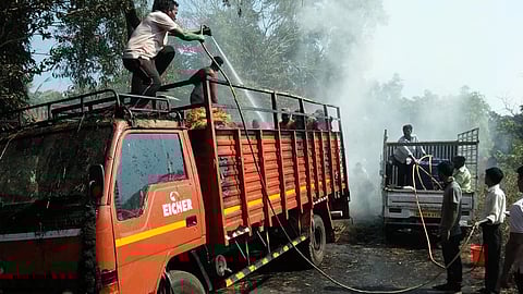 ही बाब टेम्पो चालक व शंकर गोरे यांच्या लक्षात आल्यानंतर शेजारी असलेले अशोक शेट्ये यांच्यां घरातील पाणी मारून आग आटोक्यात आणण्यासाठी प्रयत्न केला. परंतु, आग नियंत्रनात येत न्हवती. यावेळी पुनस गावचे सरपंच इलियास बंदरी, राजू साळवी , राजू जाधव, दिनेश करंबळे,राकेश पांचाळ यांच्या मदतीनें पाण्याचा टेम्पो आणून आग विजविण्यात आली. तसेच स्थानिक ग्रामस्त मदतीला धावून आले. सर्वांच्या मदतीने ट्रक मधील गवत बाहेर काढण्यात आले व आगीवर नियंत्रण मिळवले .