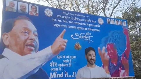 जिल्हा बँकेच्या विजयानंतर, रत्नागिरीत राणे कुटुंबाच्या समर्थनार्थ बॅनर बाजी पहायला मिळतेय. या बॅनरवर 'झुंड मे तो सुअर आते हैं, शेर अकेला ही आता है! माईंड इट, अशा आशयाचं बॅनर रत्नागिरीत (Narayan Rane Banners In Ratnagiri) झळकलेलं दिसतंय. यावरती मंत्री नारायण राणे व नितेश-निलेश राणे (Nilesh Rane) यांचा देखील फोटो पहायला मिळतोय. सिंधुदुर्ग जिल्हा बँकेवर भाजप म्हणजेच, राणे गटानं सत्ता मिळवल्यानंतर आता याचे राजकीय पडसाद कोकणात (Konkan) देखील उमटू लागले आहेत. शिवसेनेच्या बालेकिल्यात आता राणे समर्थकांनी त्यांच्या विजयाबद्दल बॅनर लावलेत. यामुळं कोकणात भाजपकडून पोस्टर वाॅर सुरु झालंय.
