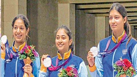 नेमबाजी या खेळामध्ये भारताला आशियाई स्पर्धेतील पहिले पदक मिळाले. रमिता, मेहुली घोष व आशी चोक्सी या भारतीय नेमबाजांनी महिलांच्या १० मीटर एअर रायफल सांघिक प्रकारात रौप्यपदक मिळवून दिले. तिघींनी १८८६ गुणांची कमाई केली. चीनच्या नेमबाजांनी १८९६.६ गुणांसह सुवर्णपदक पटकावले. मंगोलियाच्या नेमबाजांनी १८८० गुणांसह ब्राँझपदकाची कमाई केली.