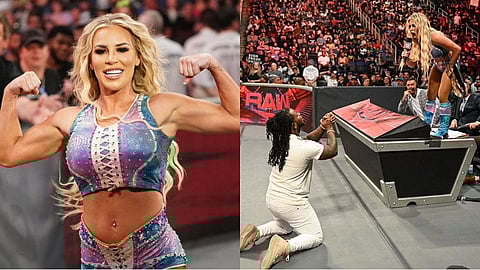 WWE Raw मध्ये या आठवड्यात खूप धोखे पाहायला मिळाले. रेगीने या आठवड्यात त्याची ऑन-स्क्रीन पत्नी डैना ब्रूकला (Dana Brooke) धोखा दिला आहे. तिच्याकडून 24/7 चॅम्पियनशिप जिंकण्याचा प्रयत्न केला. यामुळे डैना ब्रूक संतापला आणि रेगीला कानाखाली मारली. कानाखाली मारल्यानंतर हजारो चाहत्यांसमोर डैना ब्रूकने रेगीकडे घटस्फोटाची मागणी केली.(WWE 24/7 Champion Dana Brooke Want Divorce From Reggie)