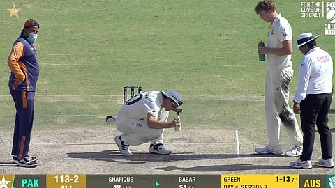 ऑस्ट्रेलिया संघाच्या खेळाडूंना गोलंदाजी करताना खराब स्पीचमुळे अडथळा निर्माण होत असल्याने कर्णधार पॅट कमिंन्सने खेळपट्टीवर हातोडा मारल्याचे पाहायला मिळाले. हा प्रकार पाहून पाकिस्तान संघाचा कर्णधार बाबर आझमने पंचांकडे याबद्दल नाराजीही व्यक्त केली. बाबर आझमने या सामन्यात दीडशतकी खेळी खेळली आहे. बाबर अजून खेळपट्टीवर खेळत आहे. पाकिस्तानाचा संघ हा सामना जिंकण्याची चिन्हे दिसत आहेत.
