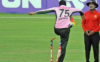 बांगलादेश संघाचा स्टार ऑलराउंडर शाकिब अल हसन याला मैदानात राग व्यक्त करणं चांगलेच महागात पडले आहे. ढाका प्रीमियर लीग (DPL) मधील टी 20 सामन्यात शाकिबने स्टंप्सवर लाथ मारल्याचे पाहायला मिळाले होते. रागाच्या भरात केलेल्या या कृत्यामुळे त्याच्यावर कारवाई करण्यात आलीये. याप्रकरणाची त्याने माफी मागितली. तरीही त्याला दंडात्मक कारवाईला सामोरे जावे लागणार आहे. अंपायरसोबत केलेल्या गैरवर्तनूक त्याला महागात पडलीये. (shakib-al-hasan-banned-for-the-4-matches-in-the-dpl-due-to-his-behaviour-to-the-umpire)