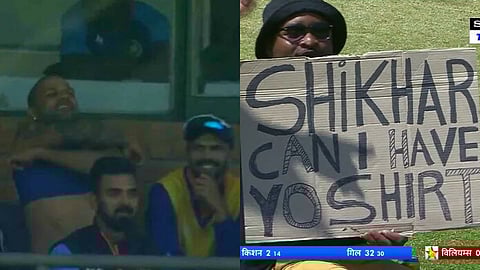 टीम इंडियाने या मालिकेत प्रथम फलंदाजी करण्याचा निर्णय घेण्याची ही पहिलीच वेळ होती. यानंतर शिखर धवन आणि केएल राहुल ही जोडी सलामी देण्यासाठी आली तेव्हा धवनची जर्सी पाहून चाहते थोडे आश्चर्यचकित झाले. धवनच्या शर्टवर खेळाडूचे नाव नाही तर टेप लावण्यात आला होता. शार्दुल ठाकूरची ती जर्सी होती जी धवनने मैदानावर घातली होती. धवनने त्याची जर्सी का घातली नाही, हे माहीत नाही, पण शिखर धवनच्या जर्सीबद्दल एक चाहता खूप उत्सुक होता. या चाहत्याचा व्हिडिओ सोशल मीडियावर चांगलाच व्हायरल झाला आहे ज्यामध्ये तो स्टँडमध्ये 'शिखर मी तुझा शर्ट घेऊ शकतो का?, असे फलक घेऊन उभे आहे.