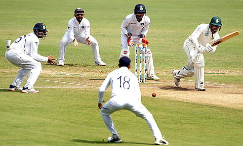 सकाळच्या सत्रात उमेश यादव आणि महंमद शमी यांनी दक्षिण आफ्रिकेच्या फलंदाजांना स्थिरावू दिले नाही. त्यानंतर अश्विन आणि जडेजा या फिरकी गोलंदाजांनी दक्षिण आफ्रिकेच्या फलंदाजांना जखडून ठेवले. मात्र, बाद करण्यात त्यांना अपयश आले. अश्विनला दोन्ही वेळा गोलंदाजीची बाजू बदलल्यावर यश आले.