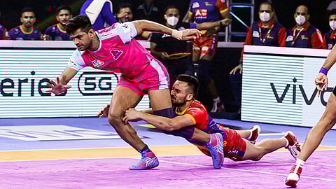 VIVO Pro Kabaddi 2021, PKL 2021 Jipur Pink Panthers vs UP Yoddha : अर्जुन देसवालच्या (Arjun Deshwal) सुपर 10 च्या जोरावर जयपूर पिंक पँथरर्स संघानं स्टार रेडर प्रदीप नरवालच्या (PardeepNarwal) यूपी योद्धा संघाला नमवलं आहे. प्रदीप नरवालला दबावात टाकण्यात जयपूरच्या बचावपटूंना यश मिळालं. हा त्यांच्या खेळाच्या रणनितीचा एक महत्त्वाचा भाग ठरला.